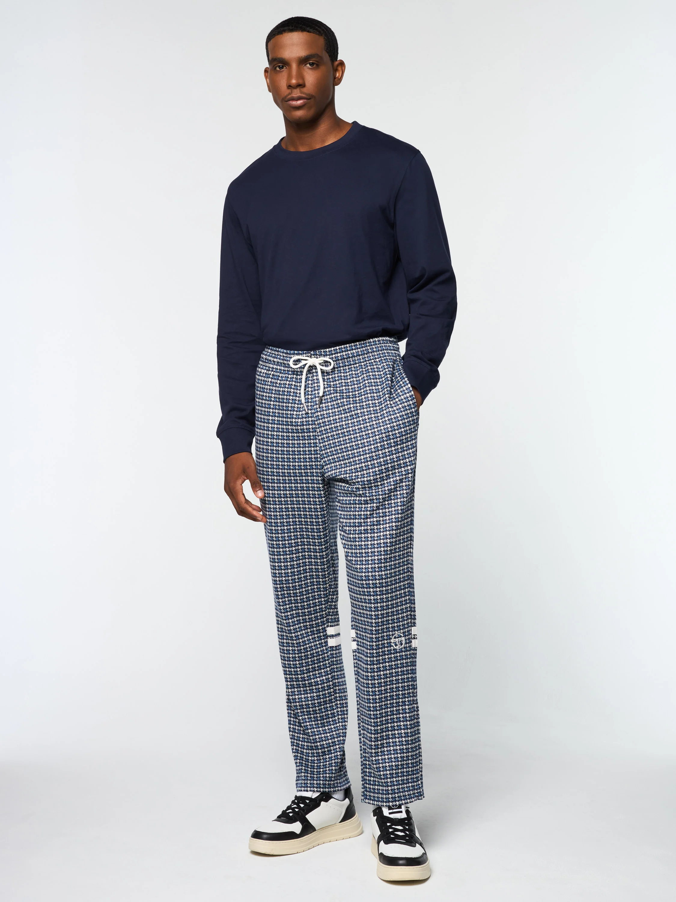 Keep it classy with the Dallas Houndstooth Track Pant, featuring an all-over houndstooth check pattern, taping stripes at the rear lower legs, and a custom woven label at the rear right zip pocket. An elevated spin on a Tacchini classic, the pants are finished with a comfortable drawstring waistband and adjustable ankle zips.